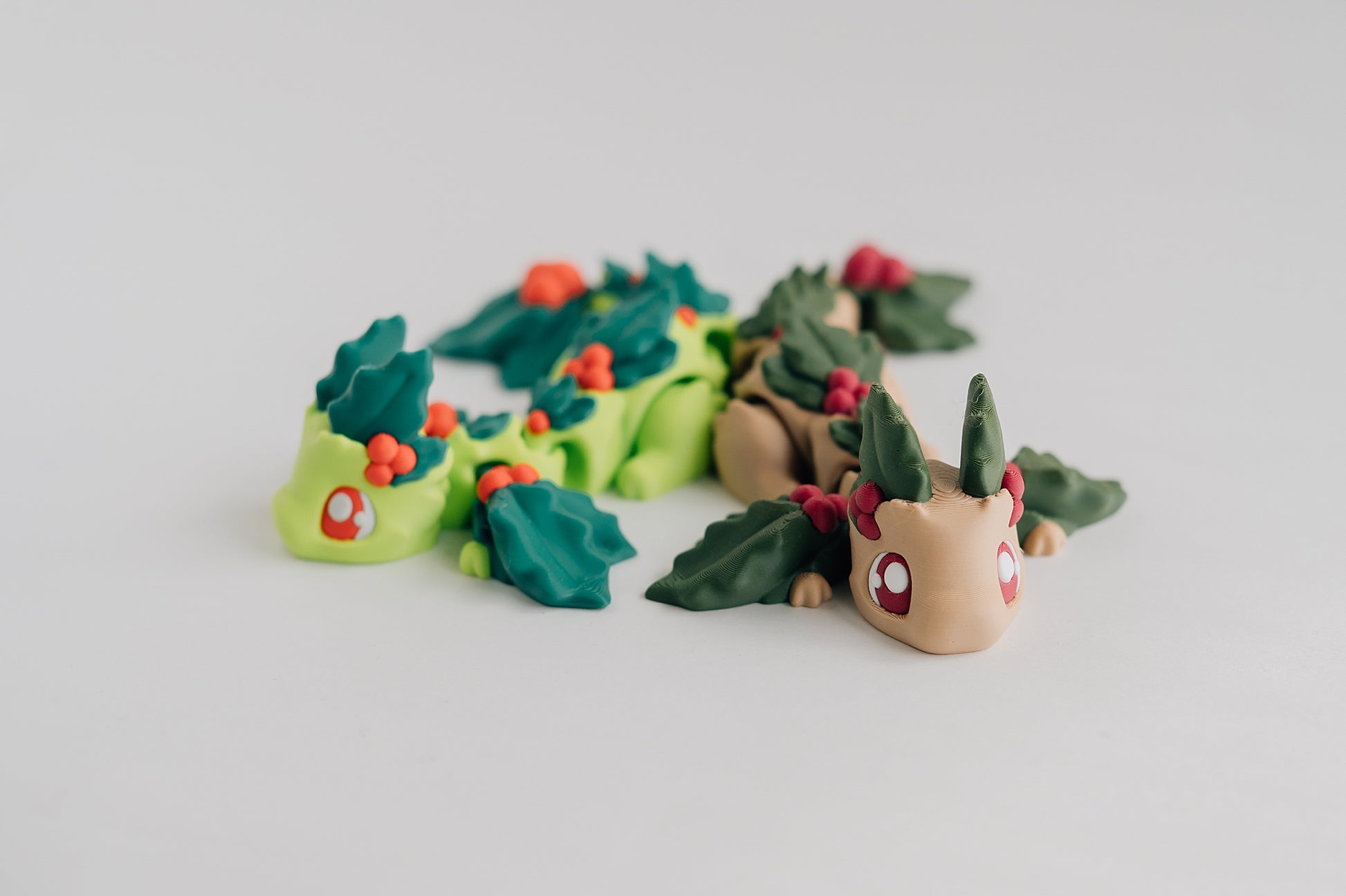 Celebrate the season with the Holly Berry Dragon Ziggle Pets, a pair of charming, holiday-themed articulated dragons bursting with festive cheer! Available in two magical colorways—bright holly green and cozy woodland brown—each dragon features detailed holly leaves, sculpted berries, and expressive eyes that bring these merry creatures to life.